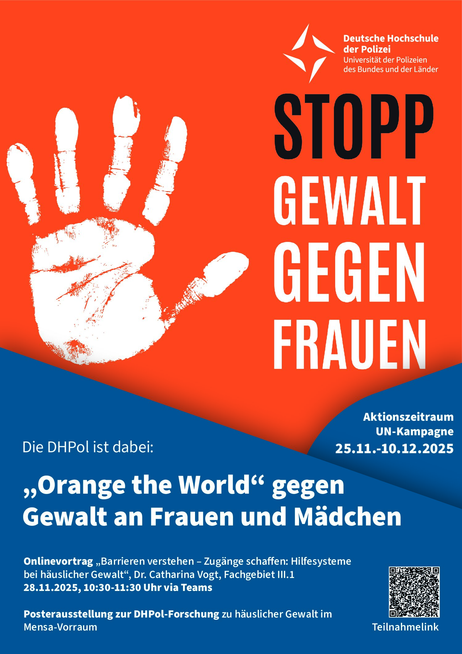 Liebe Mitglieder, die Hochschule der Polizei lädt herzlich ein zu einem einstündigen Onlinevortrag von Dr. Catharina Vogt zum Thema „Barrieren verstehen – Zugänge schaffen: Hilfesysteme bei häuslicher Gewalt“. Termin: Freitag, 28.11.2025, 10:30-11:30 Uhr via Teams Veranstaltungslink: Jetzt an der Besprechung teilnehmen Besprechungs-ID: 352 685 486 497 9 Passcode: WA9TP2jD Hinweis: Die Teilnahme ist freiwillig, eine Anmeldung ist nicht erforderlich. Dr. Vogt forscht […] |