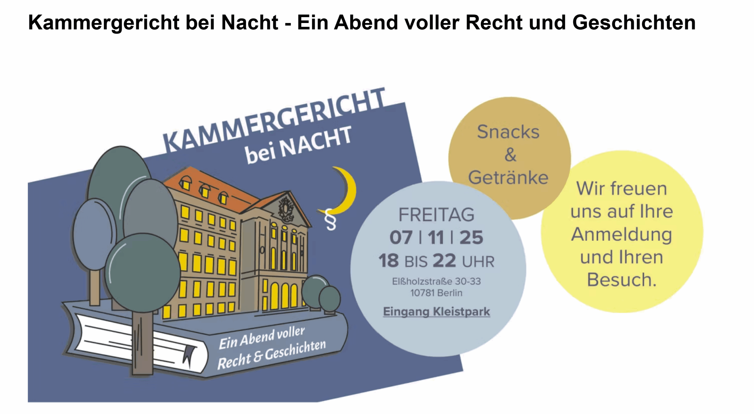 Seien Sie am 7. November 2025 von 18 bis 22 Uhr dabei! Was verbirgt sich hinter den Mauern des ältesten deutschen Gerichts (seit 1468) im Schöneberger Kleistpark? Finden Sie das Seepferdchen beim Betreten der Haupthalle und wie ist es überhaupt da hingekommen? Oder wissen Sie, warum am Kammergericht gleich vier Fahnenmaste (und nicht drei wie […] |